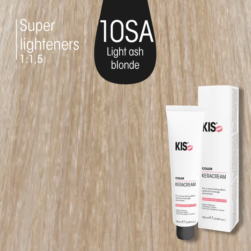 KIS KeraCream Color 10SA, 100 ml, ist eine professionelle permanente Haarfarbe aus der KeraCream-Serie. Der Farbton 10SA ist ein sehr helles, stark aschiges Blond und eignet sich ideal, um warme Gelb- und Goldreflexe deutlich zu dämpfen und ein besonders kühles, klares Blondbild zu erzielen. Die cremige Konsistenz ermöglicht ein gleichmaessiges Arbeiten und unterstützt ein gepflegtes, glänzendes Ergebnis.