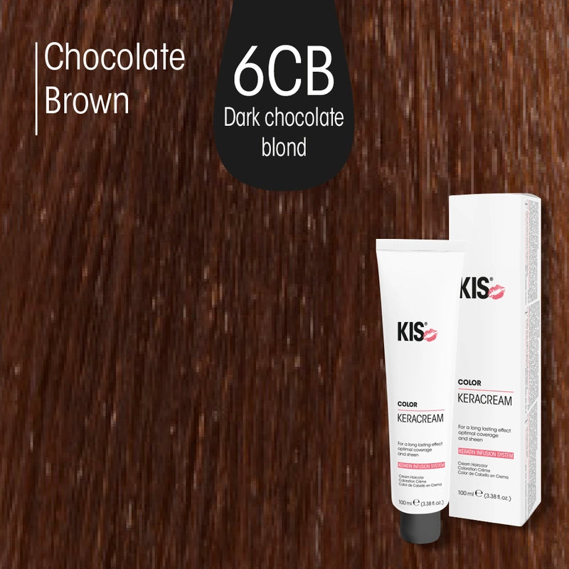 KIS KeraCream Color 6CB ist eine permanente Haarfarbe als Farbcreme für ein schokoladiges Dunkelblond (kühler bis neutraler Braun-Blond-Mix, je nach Ausgangsfarbe). Entwickelt für präzise, gleichmässige Farbergebnisse und mit Keratin-Infusion-System für Pflege während der Coloration.