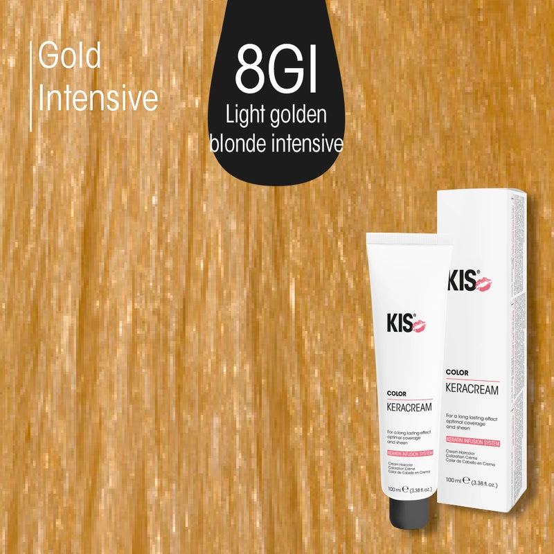 KIS KeraCream Color 8GI is a permanent cream hair color in Light Golden Iridescent Blonde. It blends warm golden tone with a subtle iridescent shimmer for a brighter, more dimensional blonde result.