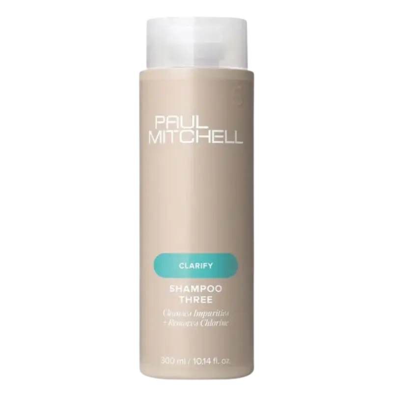 Shampoo Three is a deep-cleansing clarifying shampoo great after swimming (chlorine), in hard-water areas, or whenever hair feels coated by styling buildup. It removes residue, leaves hair feeling lighter, and helps reduce “chlorine green” tones on lighter hair. Also handy before a deep treatment.